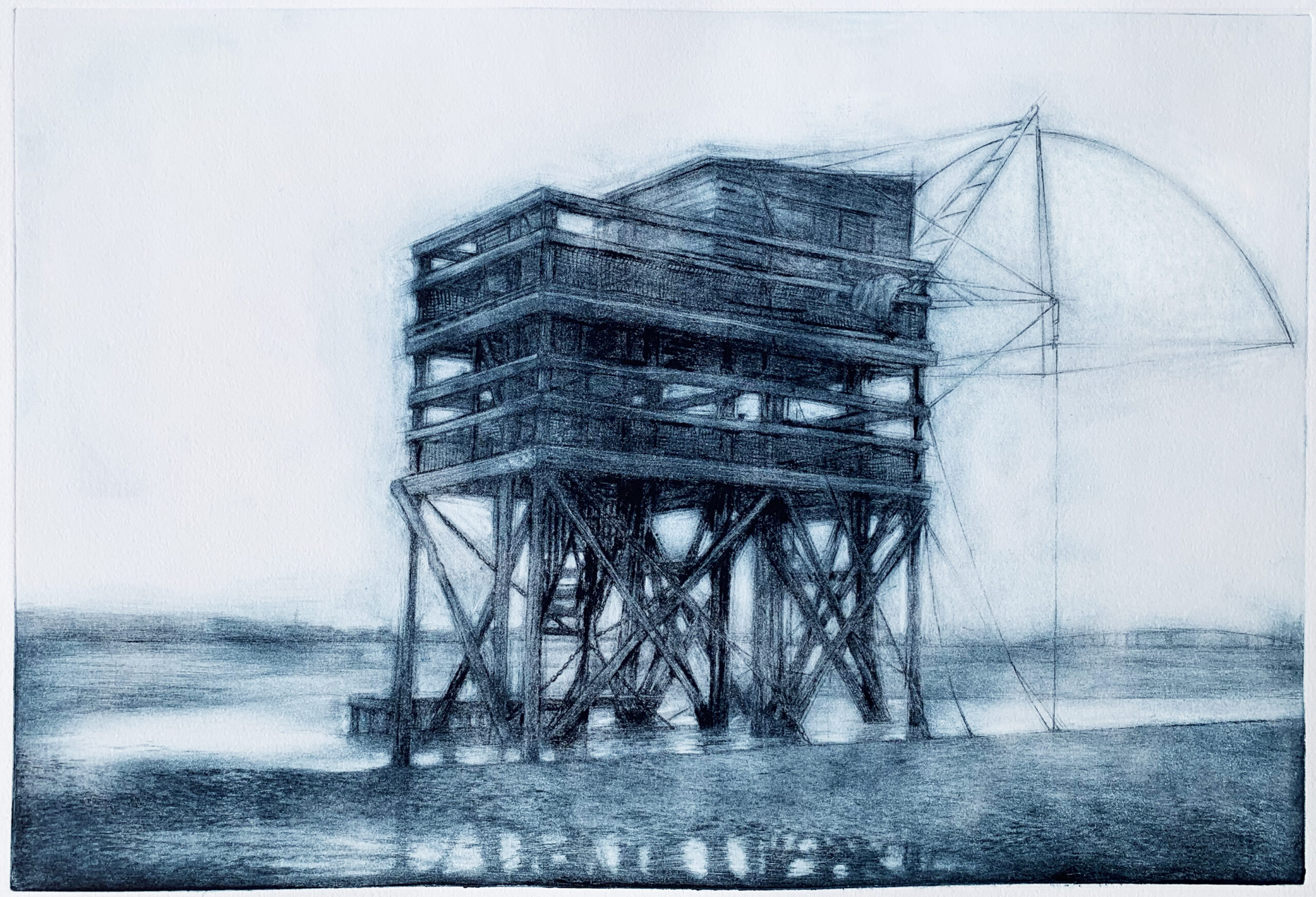 Drypoint print in Prussian Blue of an abandoned fisherman’s hut at Saint-Nazaire, France.